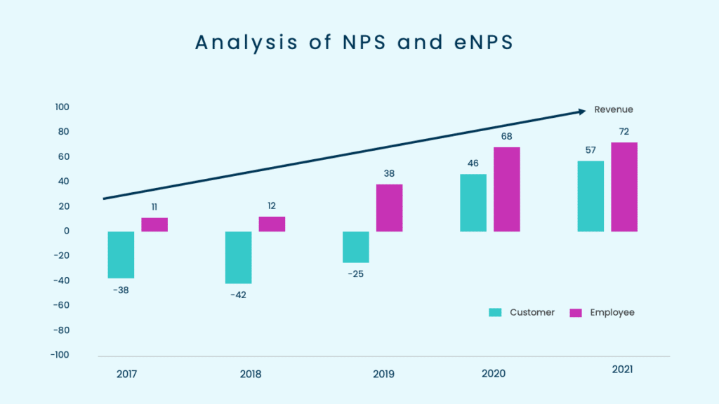 Let’s consider an example of this from one of our customers. Back in 2017, the CEO of the company started to measure NPS and eNPS in parallel. He was confident that the feedback they had received from 2017 up to today had revolutionalized their business. You can see this represented by the ‘Revenue’ line in the diagram below.