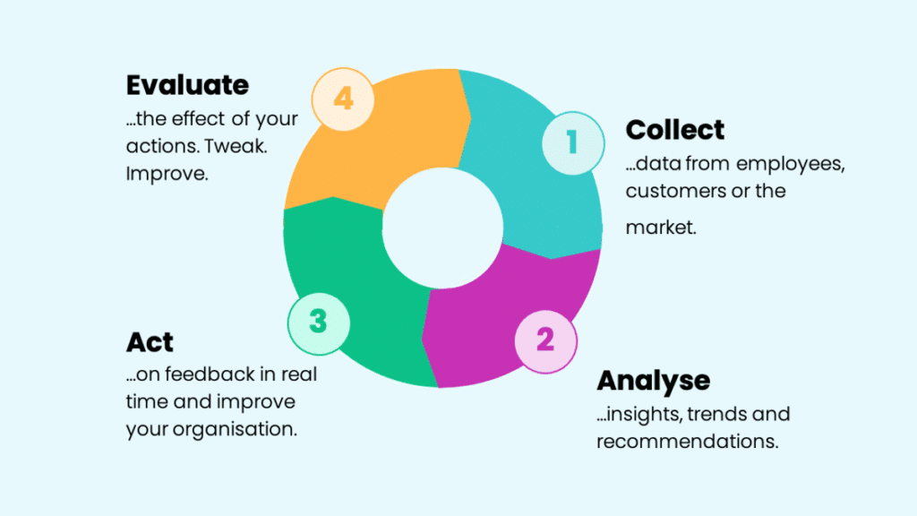 At its core, defining a clear feedback process is simple. The first step is to have a robust system in place for collecting feedback from employees and customers. Step 2 will involve analysing the feedback you collect in order to identify insights, trends and recommendations. The third step, acting on your feedback, is the most important of all. Only by acting on the feedback you receive can you have a real impact on your people and organization.