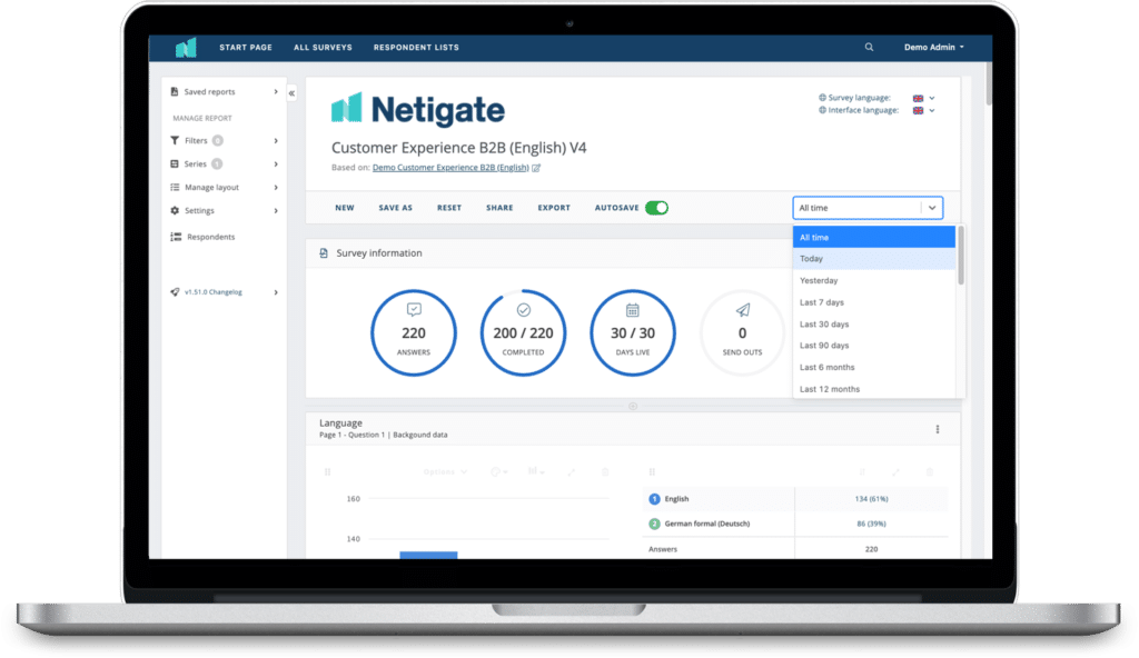 As soon as you gain access to the new version, you can just as easily access all existing data in Netigate. All surveys are still running as before and without disruptions, which ensures all collected data remains unchanged. In the new report column, you will be able to look at all collected answers from your previous survey projects. If you have collected and saved reports from surveys in the classic report system, you can easily transfer them into the new report system to be able to continue using and editing them.