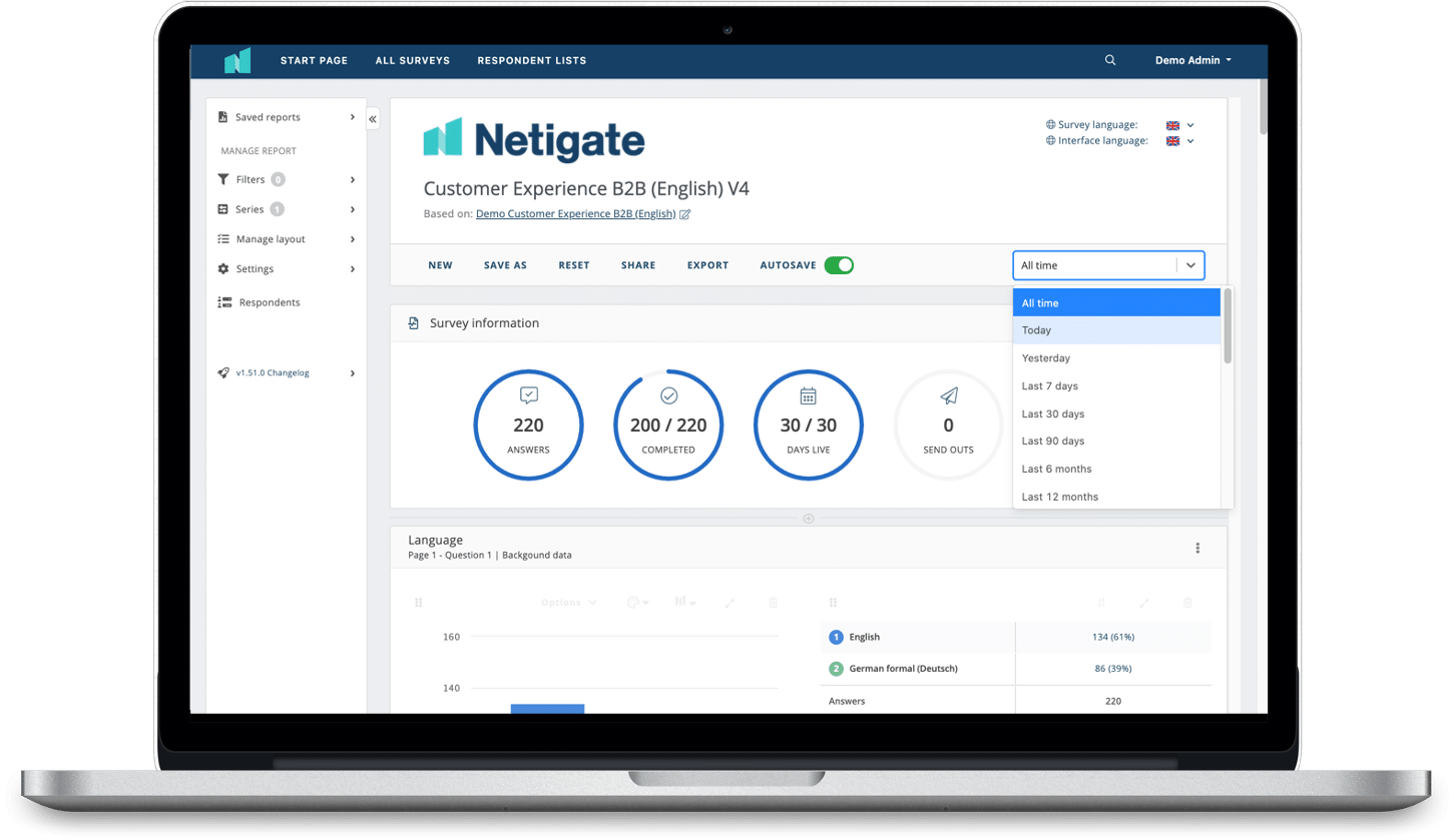 - More metrics for your survey data: i.e. timeline for received answers, drop-off analysis, custom index (CSI, ESI, average)