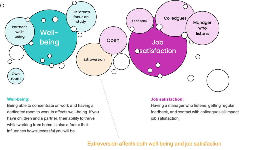 Personality, and whether other family members enjoy working from home, seem to be decisive factors for well-being and job satisfaction. If children in the home find focus for their studies, and partners also enjoy working from home, these are favorable factors for successful remote working.