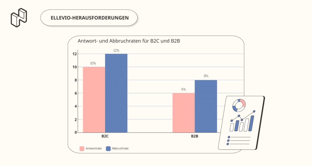 Ellevio, ein schwedisches Energieunternehmen, hatte große Probleme mit zwei Umfragen, die darauf abzielten, die Meinung von B2C- und B2B-Kund*innen über ihre Marke zu ermitteln. Bei einer Rücklaufquote von nur 10 % bzw. 6 % stellte das Unternehmen außerdem fest, dass 12 % der B2C-Kund*innen die Umfrage auf der ersten Seite abbrachen, während 8 % der B2B-Teilnehmenden im gleichen Schritt absprangen.