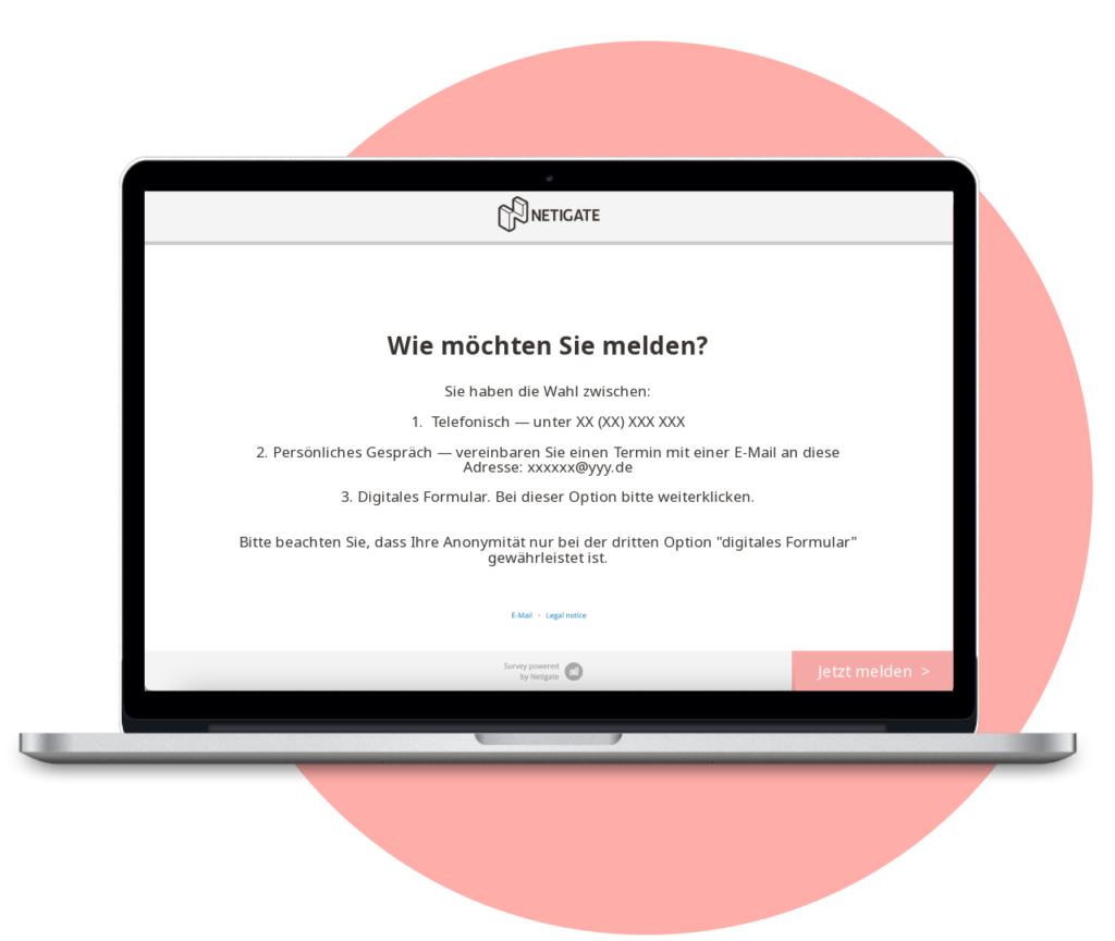 Im Zuge des Hinweisgeberschutzgesetzes hat Netigate eine sichere und schnell umsetzbare Lösung entwickelt. Wir bieten einen sicheren Weg für Mitarbeitende und Stakeholder potenzielle Missstände, Betrug oder ethisches Fehlverhalten anonym zu melden.