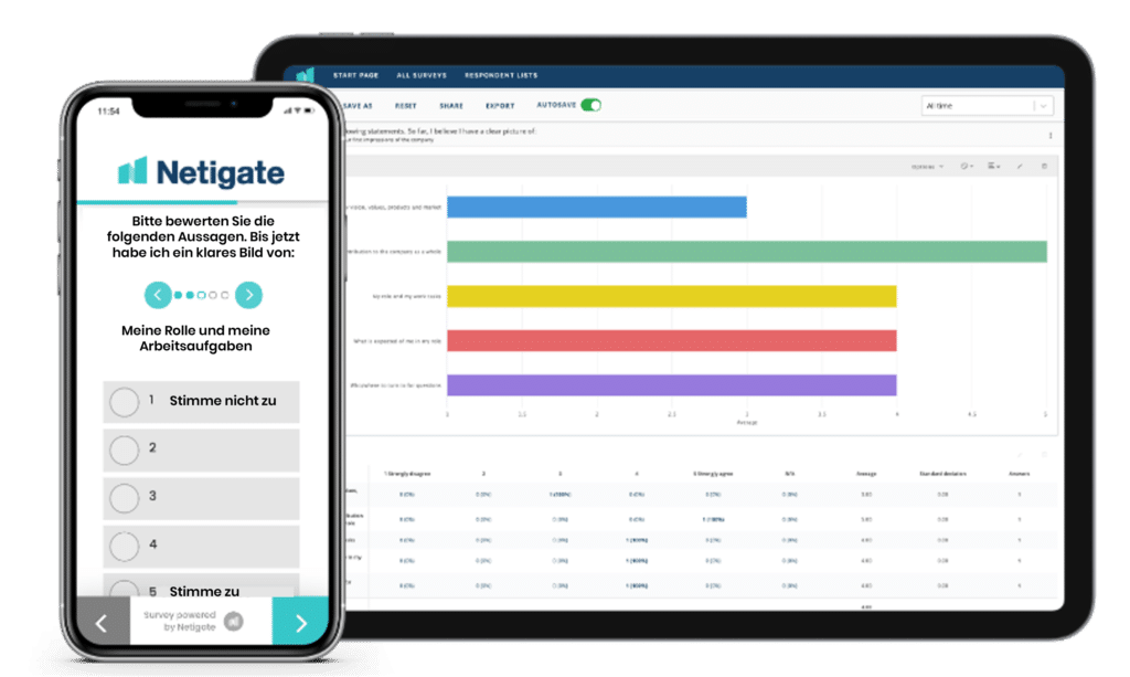 Wir bei Netigate unterstützen Sie dabei, Mitarbeiterfeedback zu sammeln und es für positive Veränderungen zu nutzen. Mit unserer Feedback-Plattform finden Sie heraus, was Ihre Mitarbeiter wollen und brauchen. So erhalten Sie die Erkenntnisse, die Sie benötigen, um eine starke Unternehmenskultur zu schaffen und die allgemeine Zufriedenheit zu verbessern.