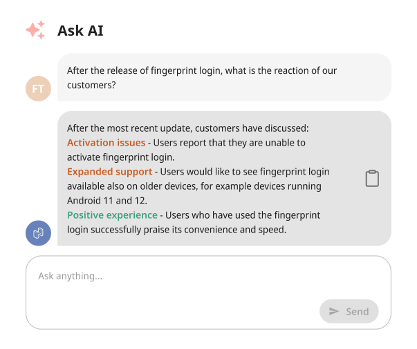 Identify positive and negative trends in feedback data and track them over time. Get summaries from thousands of data from different channels (such as comparison websites) and touchpoints for a holistic view.
