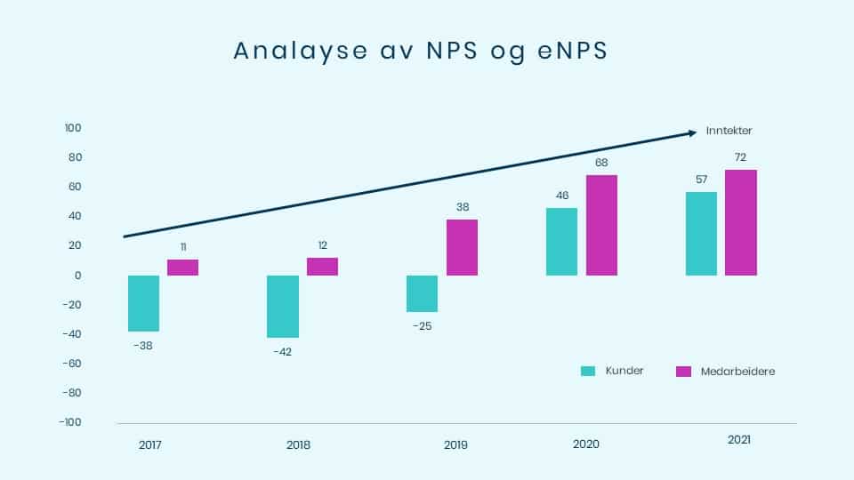 La oss se på et eksempel på dette fra en av våre kunder. I 2017 begynte konsernsjefen i selskapet å måle NPS og eNPS parallelt. Han var overbevist om at den feedback de har mottatt fra 2017 til i dag, har revolusjonert virksomheten deres. Du kan se dette av inntektslinjen i diagrammet nedenfor.