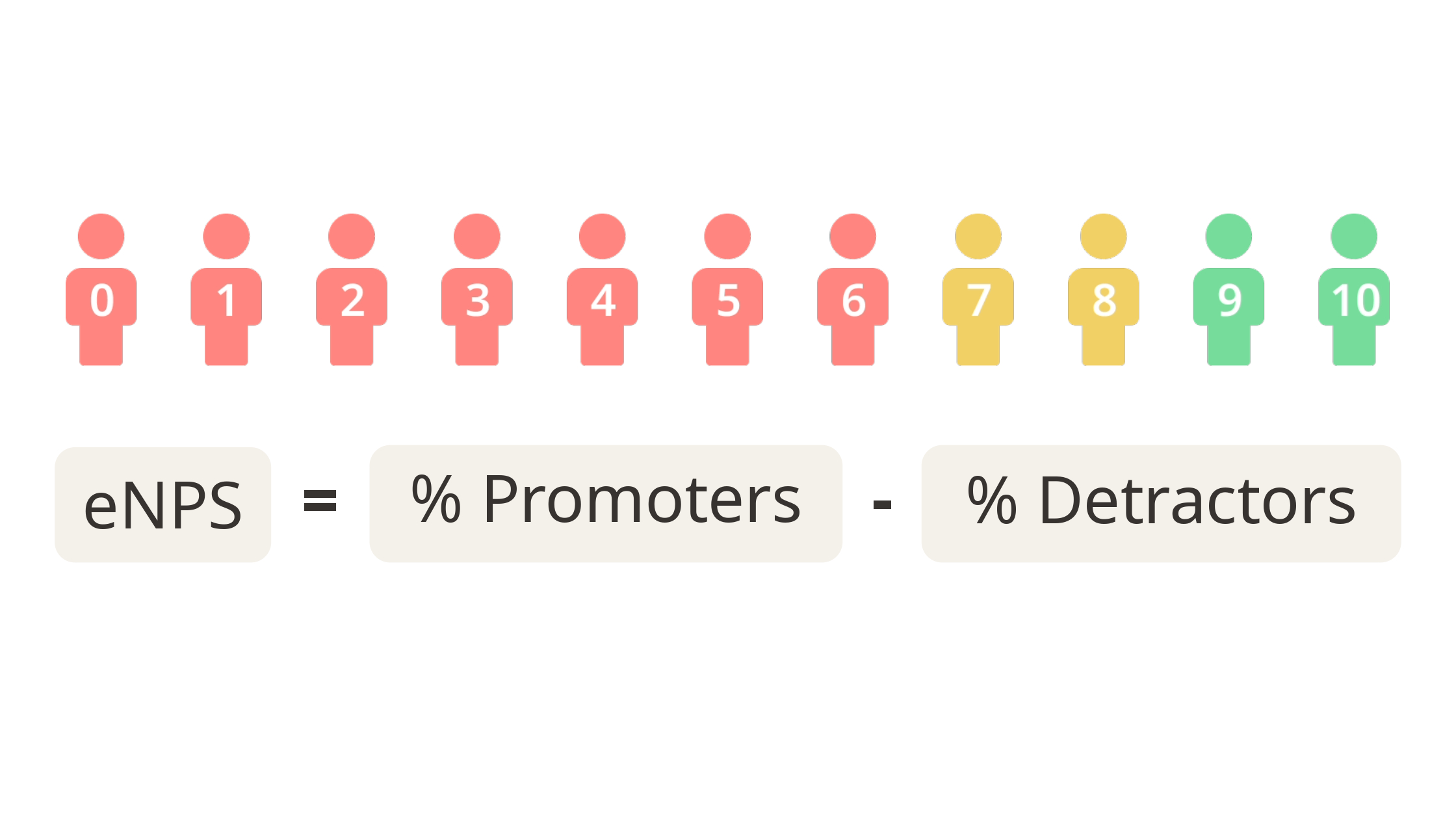 Det er svært enkelt å beregne din eNPS-score! Du trekker ganske enkelt prosentandelen av ‘Kritikere’ fra andelen ‘Ambassadører’. Passive medarbeidere (som vurderte deg til 7 eller 8) er ikke med i beregningen (men de er definitivt fortsatt viktige å huske på. Vi kommer tilbake til dette senere).