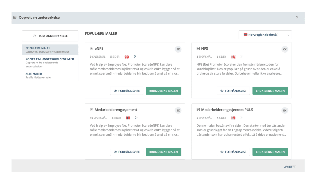 For brukere som skal lage en undersøkelse for første gang, eller de av dere som ønsker å spare litt ekstra tid og arbeid, er våre undersøkelsesmaler tingen. Med en ferdig undersøkelsesmal er det raskt og enkelt å lage profesjonelle undersøkelser som garantert gir deg gode innsikter å handle etter. Med undersøkelsesmaler kan alle i bedriften bli en feedback-ekspert på et blunk!