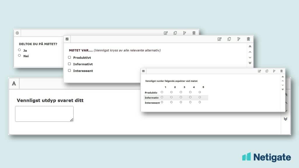 Netigate gir deg verktøyene du trenger for å nå målgruppen din. Book et onlinemøte med oss i dag, så forteller vi deg mer om hvordan vi kan hjelpe deg å ta ditt feedback-arbeid til neste nivå. Du kan også prøve vår plattform kostnadsfritt i 30 dager.
