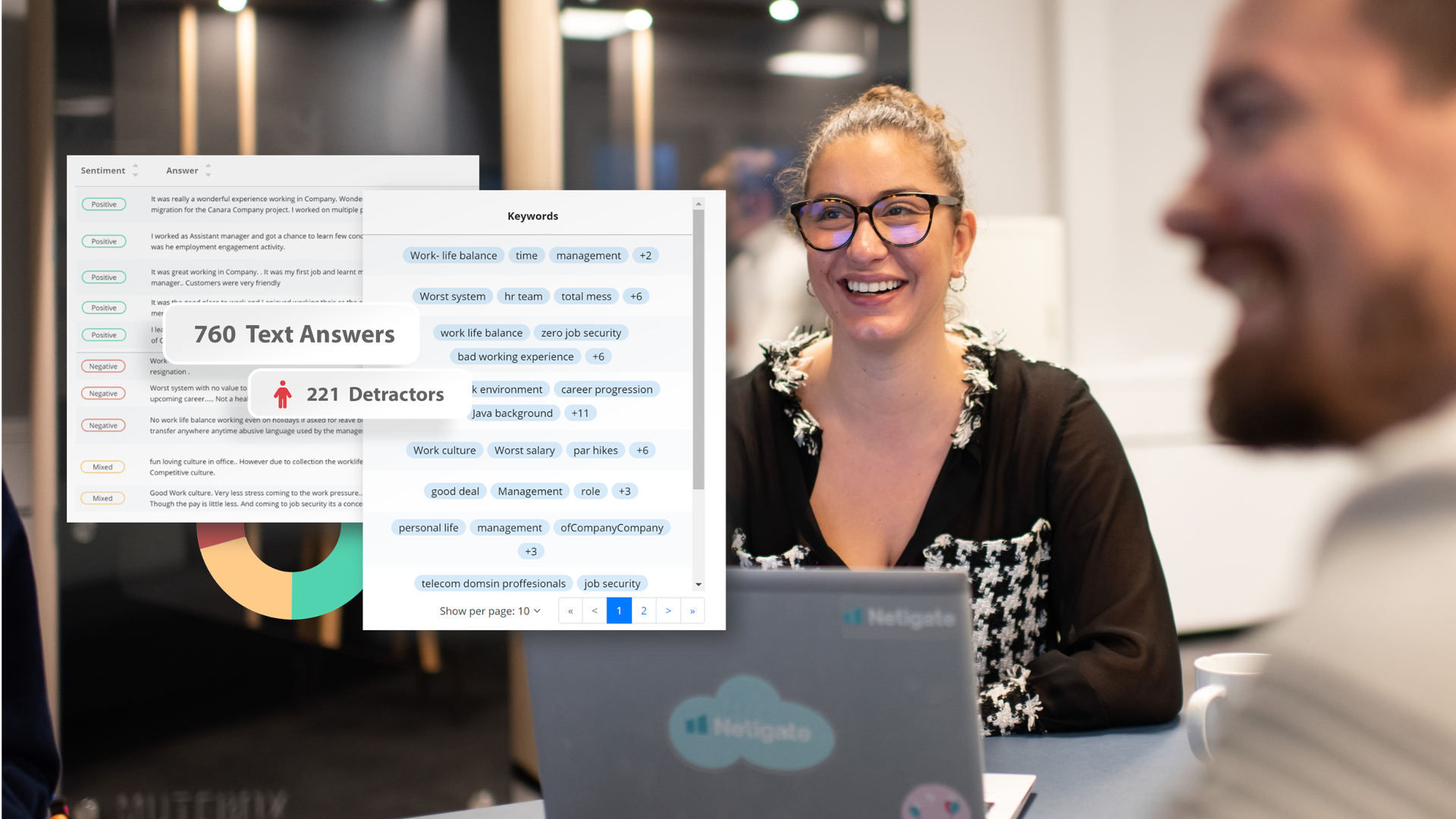 Ekstraksjonen av nøkkelord i Netigates tekstanalyse gjør at du kan forstå de sentrale begrepene i tekstsvarene uten å måtte lese dem helt på egen hånd. Den bruker en naturlig språkbehandling for å identifisere og trekke ut ord og uttrykk fra ustrukturerte data. Dette hjelper deg med å raskt oppdage trender og mønstre i tusenvis av åpne tekstsvar.