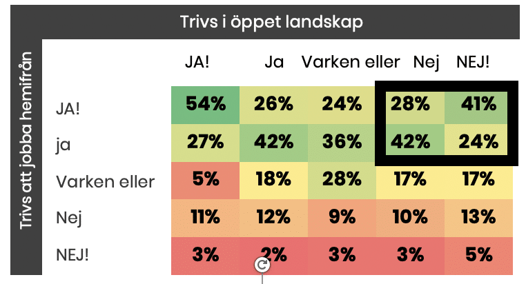 2/3 av dem som inte gillar öppna kontorslandskap har trivts bättre med att arbeta ensamma under Corona. Introverta personer tenderar att arbeta hemifrån istället för att arbeta i ett öppet kontorslandskap.