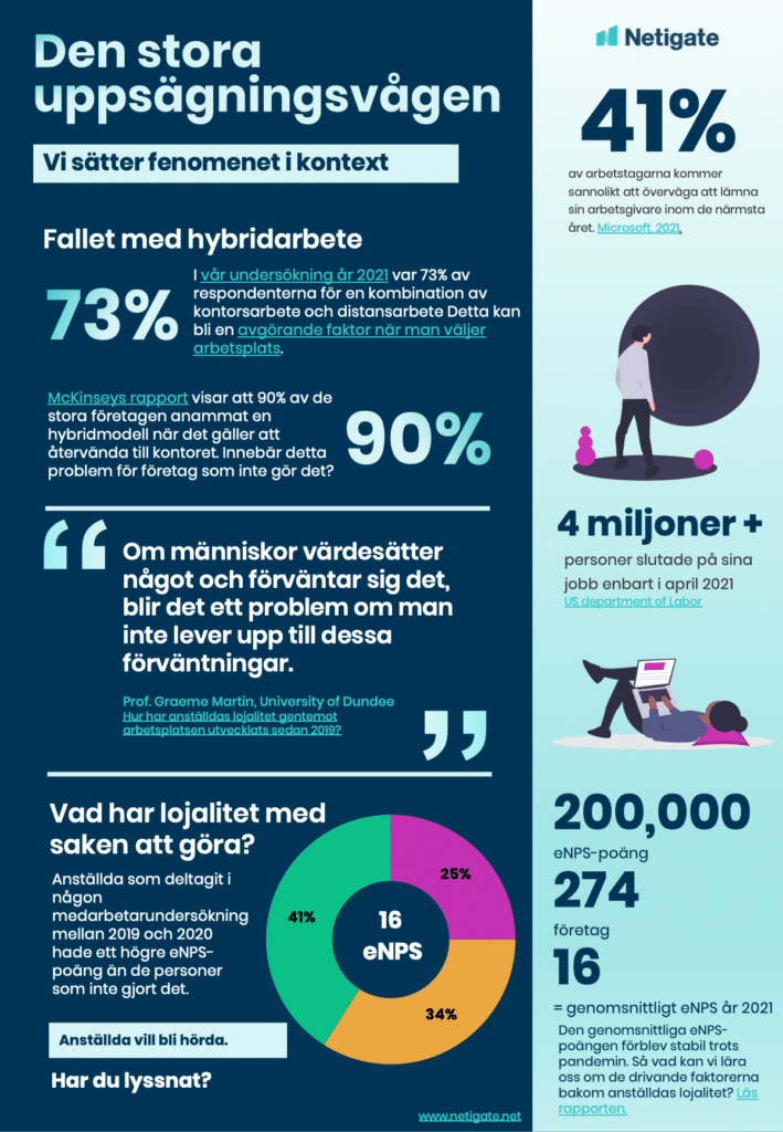 Innan sommaren genomförde vi en stor undersökning kring utveckligen av medarbetarlojaliteten mellan 2019-2021. Vi var särskilt intresserade av att undersöka drivkrafterna bakom lojaliteten och hur denna har förändrats sedan början av pandemin. För att göra detta undersökte vi över 200 000 eNPS (Employee Net Promoter Score) från 274 olika företag i olika branscher och länder. När vi gjorde detta kunde vi se att den genomsnittliga poängen fortsatt varit stabil trots pandemin. Dessa fynd var intressanta, särskilt när man undersöker dem i samband med den stora uppsägningsvågen.