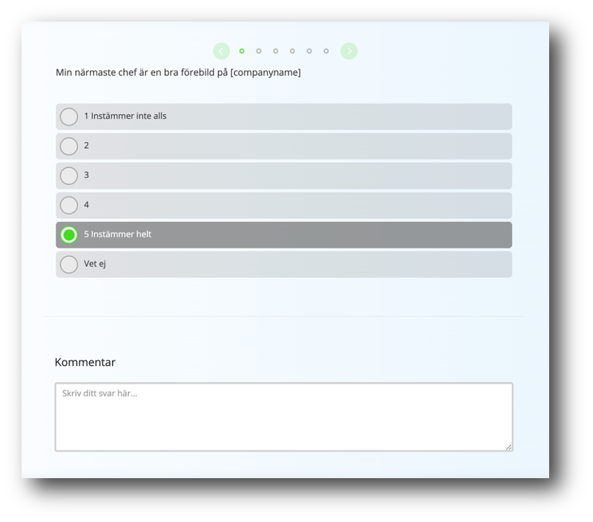 Fritextsvar gör det möjligt för respondenterna att skriva en text. Denna typ av fråga i din medarbetarundersökning är utmärkt att använda när du vill att respondenterna ska kommenterar eller motivera sitt svar. Låt oss titta på ett exempel: