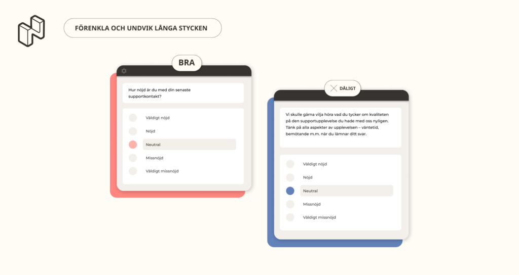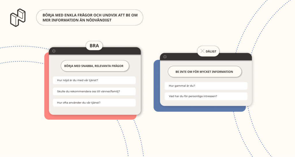 Att inleda med komplexa frågor kan överväldiga respondenter. Börja istället med enkla, relevanta frågor som går snabbt att besvara – det skapar en smidig upplevelse och motiverar dem att fortsätta.
