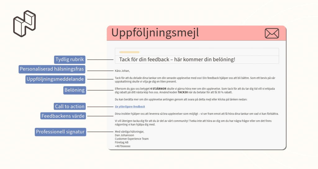 - Gör det personligt: Människor svarar på det som känns relevant. Använd kundernas namn, hänvisa till deras senaste beställningar och visa dem att deras åsikter är viktiga för dig.