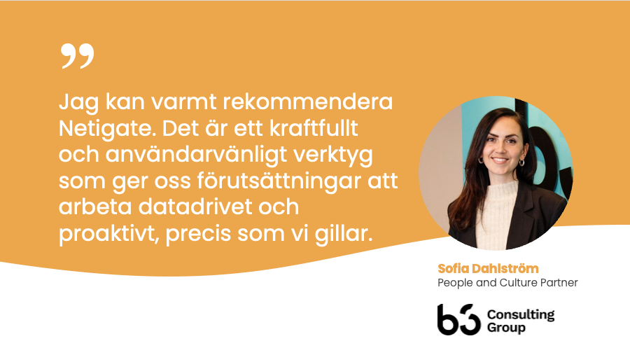 Att ha en Customer Success Manager som ger oss värdefulla insikter tillsammans med Netigates Professional Services-team som är experter på analys är väldigt värdefullt! – Sofia Dahlström, People and Culture Partner på B3 Consulting Group